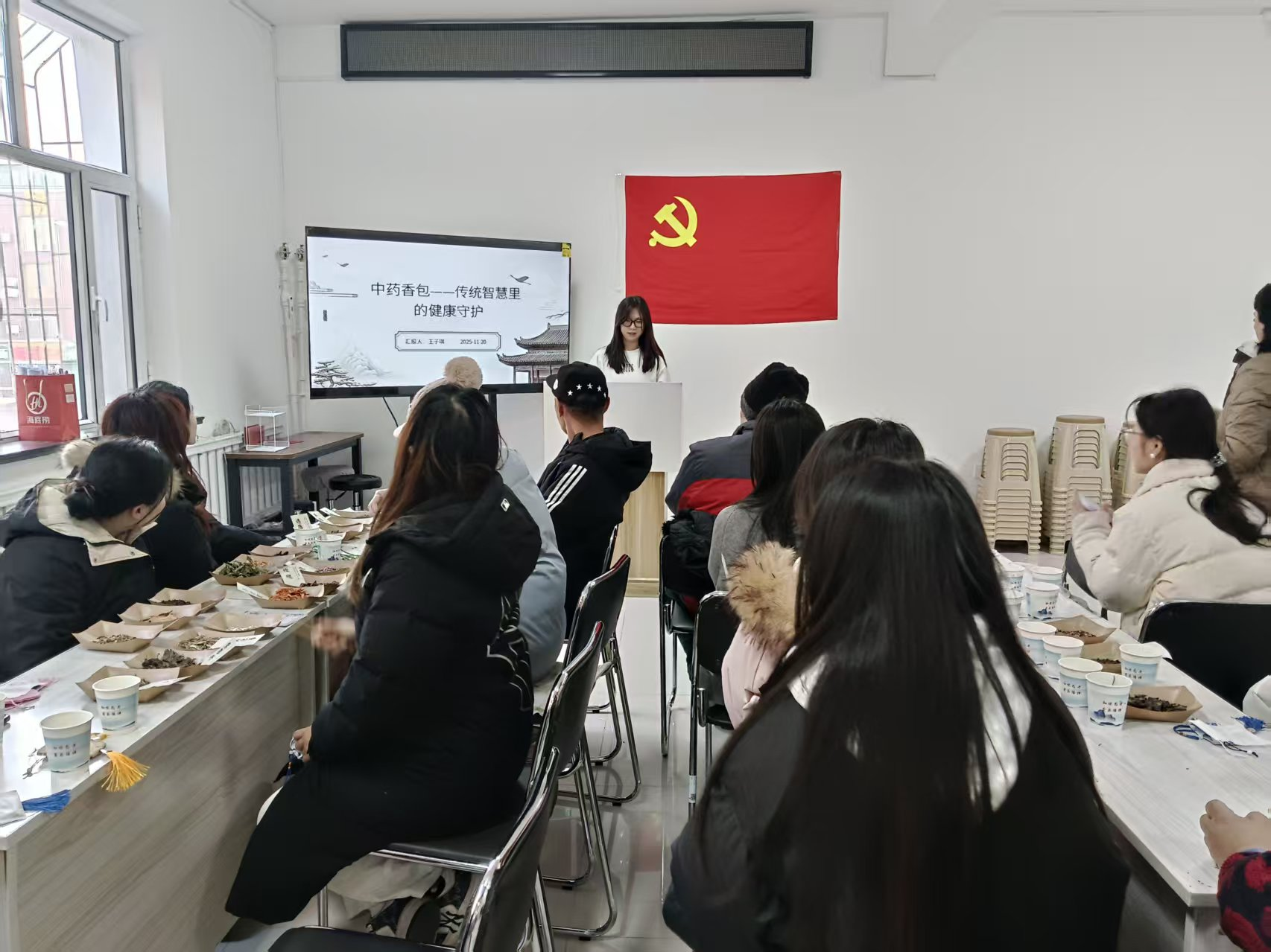 为传承中华优秀传统文化,发挥党建引领文化传承与健康养生融合的作用,11月20日,我院学生第二党支部走进老年社区,以中药香囊为纽带开展了主题党日活动暨志愿服务活动。支部成员王子琪通过PPT生动讲解传统养生智慧,其他学生党员现场帮扶指导,在药香与笑语中为社区老人们送去健康关怀。