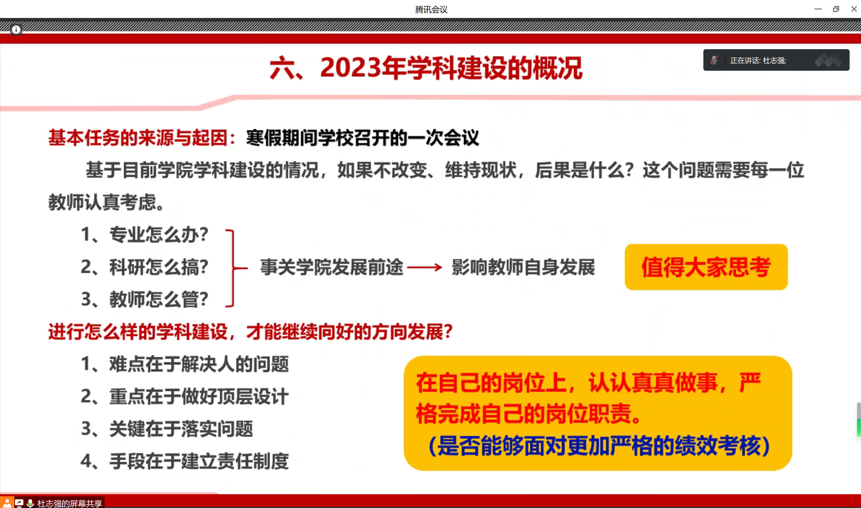 为了准确把握太阳集团的内涵,持续推进生物学博士点的申报工作,积极谋划学院的高质量发展之路,我院于2023年2月16日下午2:30至5:30,通过腾讯会议在线召开了太阳集团专题会议,包括系部主任、科研团队负责人、国家基金申请书撰写人在内的43名教师参加了本次会议。