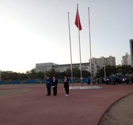 国旗护卫队迈着整齐铿锵的步伐走向国旗台,伴着雄壮的《义勇军进行曲》,鲜艳的五星红旗在师生们庄严的注目礼中冉冉升起,迎风飘扬。