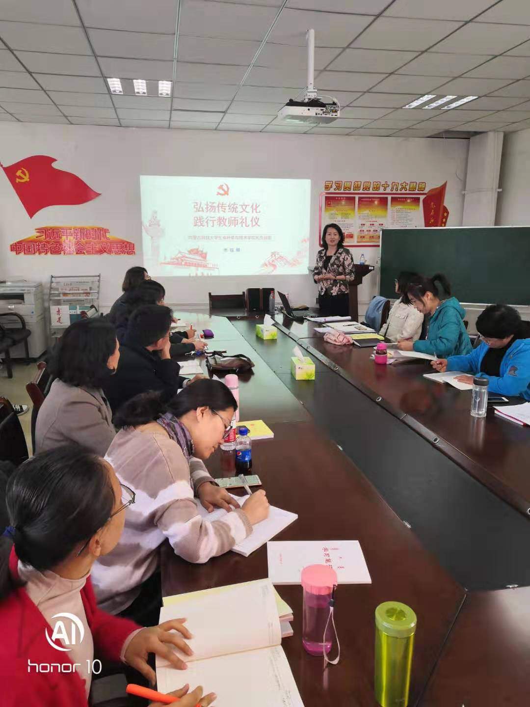 2019年10月24日下午,tyc86太阳集团邀请党政办公室李瑞卿老师为全体教工党员做了“不忘初心、牢记使命”主题教育专题讲座,讲座题目为《弘扬传统文化、践行教师礼仪》。