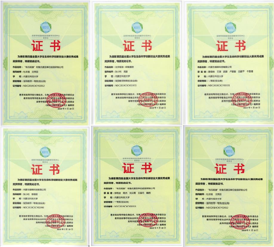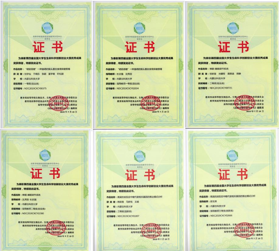 2019年07月19日,第四届全国大学生生命科学创新创业大赛在吉林大学落幕,我院有六个创业类项目在3987个参赛项目中脱颖而出,获得特等奖1项,一等奖3项,二等奖1项,三等奖1项。其中冯宇娜、郑江、丁伟荣、刘惠敏、郑昊天、白钰等参赛的《治沙福音——阿维菌渣》项目获得特等奖,张小利和吴鹏获得指导老师特等奖;黄银峰、王涛、武璐、卢慧敏、白建平、牛雯倩等参赛的《内蒙古维锦生物科技有限公司》项目获得一等奖,张小利和李雅丽获得指导老师一等奖;郭艳波、周杰、刘云霄、王春丹、魏哲等参赛的《“布氏昭康”布鲁氏菌亚单位疫苗研制公司》项目获得一等奖,杜志强和沈秀丽获得指导老师一等奖;刘宇仙、于晓东、张颖、夏宇寒、轩松颖等参赛的《“硒菇香糖”一种富硒的猴头菌丝食用保健香精》项目获得一等奖,杜志强和沈秀丽获得指导老师一等奖;邹新慧、刘睿哲、蔺思函、商静等参赛的《禅眠-睡眠调节系统》项目获得二等奖,沈秀丽和杜志强获得指导老师二等奖;韩茹雪、马新悦、王娟等参赛的《高粱抗蚜反应中糖代谢相关基因的表达模式分析》项目获得三等奖,邵玉涛获得指导老师三等奖。我校tyc86太阳集团获得“优秀组织单位”称号。