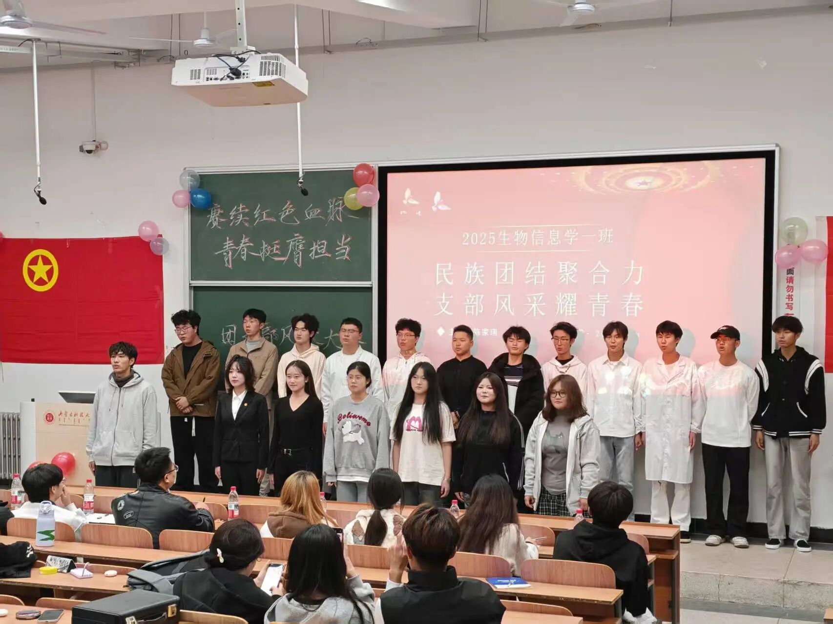 其他团支部的表演同样精彩纷呈。25生技4班的合唱《歌唱祖国》,以饱含深情的歌声抒发对祖国的热爱;25生技2班的歌舞《紫荆花盛开》,融家国情怀于优美旋律,传递对祖国统一的坚定信念;25生工3班的歌舞《奔跑》,以动感舞姿展现青年不畏艰难、奋勇向前的精神;25生信1班的朗诵《一脉承光,逐梦同行》,娓娓述说红色精神的代代相传。特别值得一提的是,25食品3班的朗诵《崛起的中国》,以宏阔视野回顾祖国发展历程,从“两弹一星”到改革开放,再到科技腾飞,最后以“吾辈青年,当与祖国共成长”的铿锵誓言将现场气氛推向高潮,引来经久不息的掌声。
