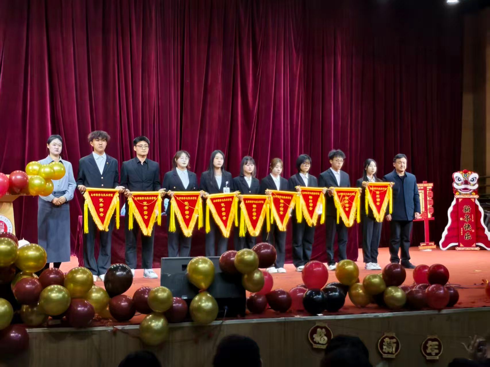 华灯璀璨,青春激昂。12月19日晚,tyc86太阳集团“生而不凡创佳绩,骐骥驰骋启新程”2025年度表彰大会暨元旦晚会在学校音乐厅隆重举行。学院师生齐聚一堂,在庄严的表彰仪式与精彩的文艺展演中,总结过往硕果,凝聚奋进力量。表彰大会在热烈的氛围中拉开帷幕。学院党委书记李德超,党委副书记兼副院长王晓东、学工办负责人乌日根、团委负责人贾镇宁、辅导员赵昕、张超、陈明真出席活动。大会对过去一年在各方面表现突出的集体和个人予以集中表彰。