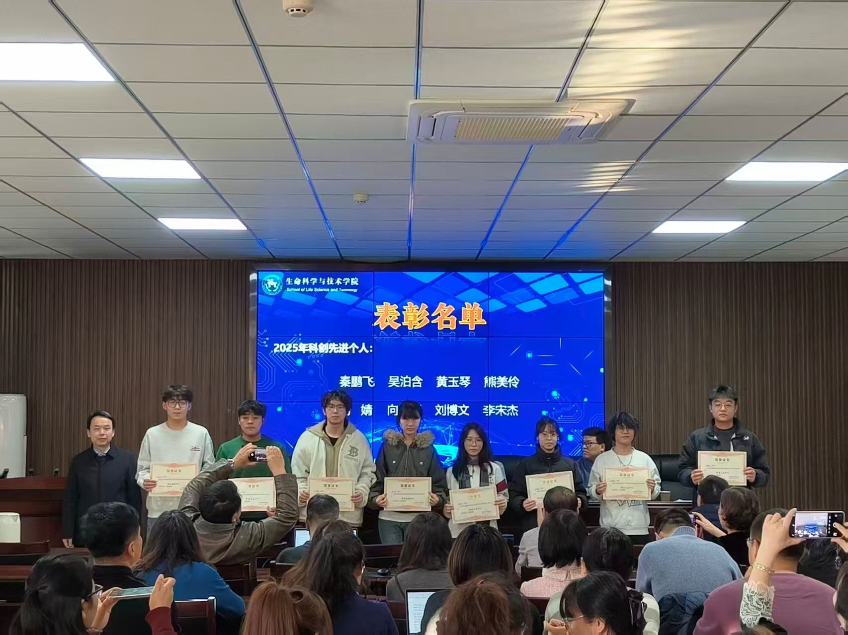 会议伊始,杜志强院长宣读了学院2025年度科技创新先进表彰决定。随后,在热烈的掌声中,2025年获奖师生先后登台,从院领导手中接过承载着肯定与敬意的证书。