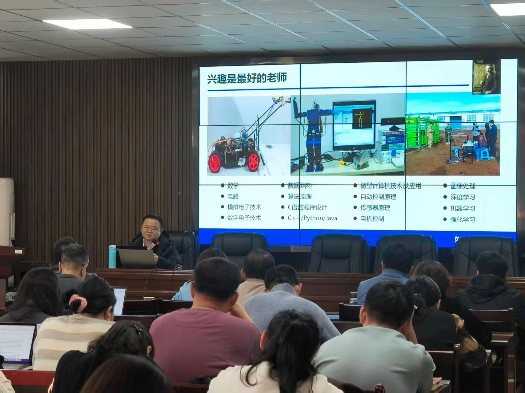 本次活动特邀自动化与电气工程学院赵建敏教授作主题分享。赵建敏教授长期致力于嵌入式及物联网技术、计算机视觉与人工智能在工农牧领域的应用研究,主持多项国家级、省部级课题,科研成果丰硕,尤其在指导学生科创竞赛方面经验丰富,曾带领团队在中国国际大学生创新大赛、“挑战杯”、全国大学生电子设计竞赛等赛事中屡获国家级奖项。