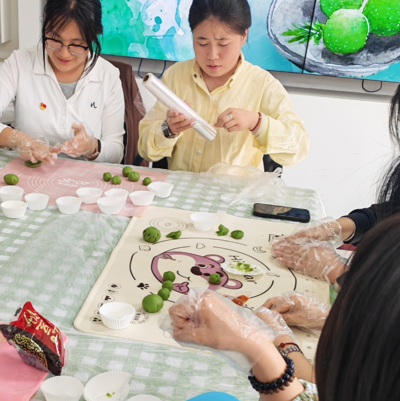 党员同志与社区党员、工作人员一对一结对协作,揉面、包馅、塑形井然有序,现场气氛热烈而温馨。大家边做边聊,分享民俗故事、交流制作心得,一个个圆润饱满的青团陆续成型,不仅寄托着清明时节的节日哀思,更凝聚了深厚的党群情谊。
