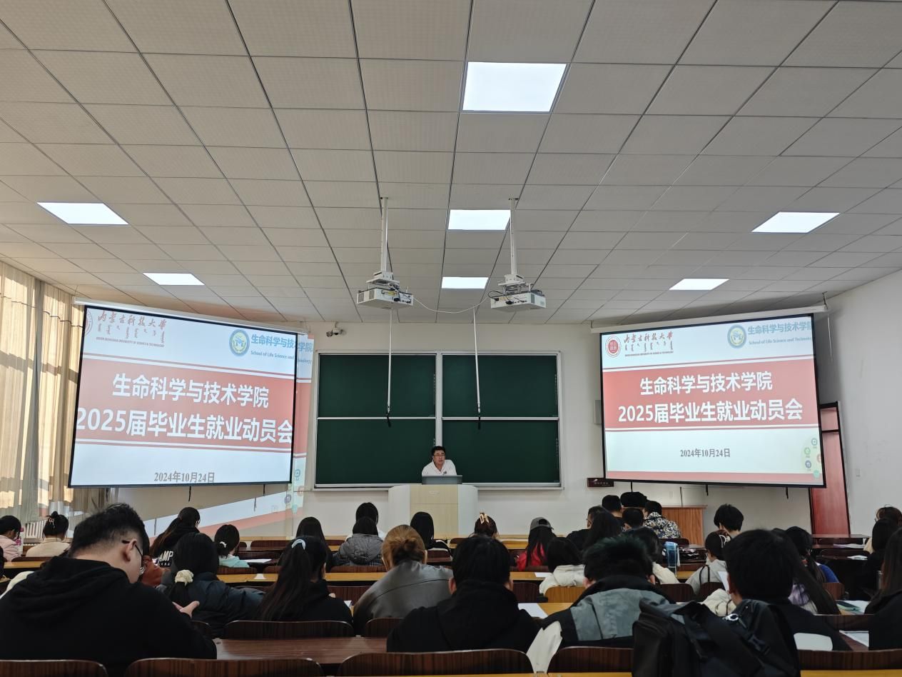 10月23日,tyc86太阳集团举办2025届毕业生就业动员会,本次动员会分两个会场进行,学院党委副书记兼副院长王晓东为生物技术专业和食品科学与工程专业的学生动员,学院就业辅导员乌日根为生物工程专业和生物信息学专业的学生动员。