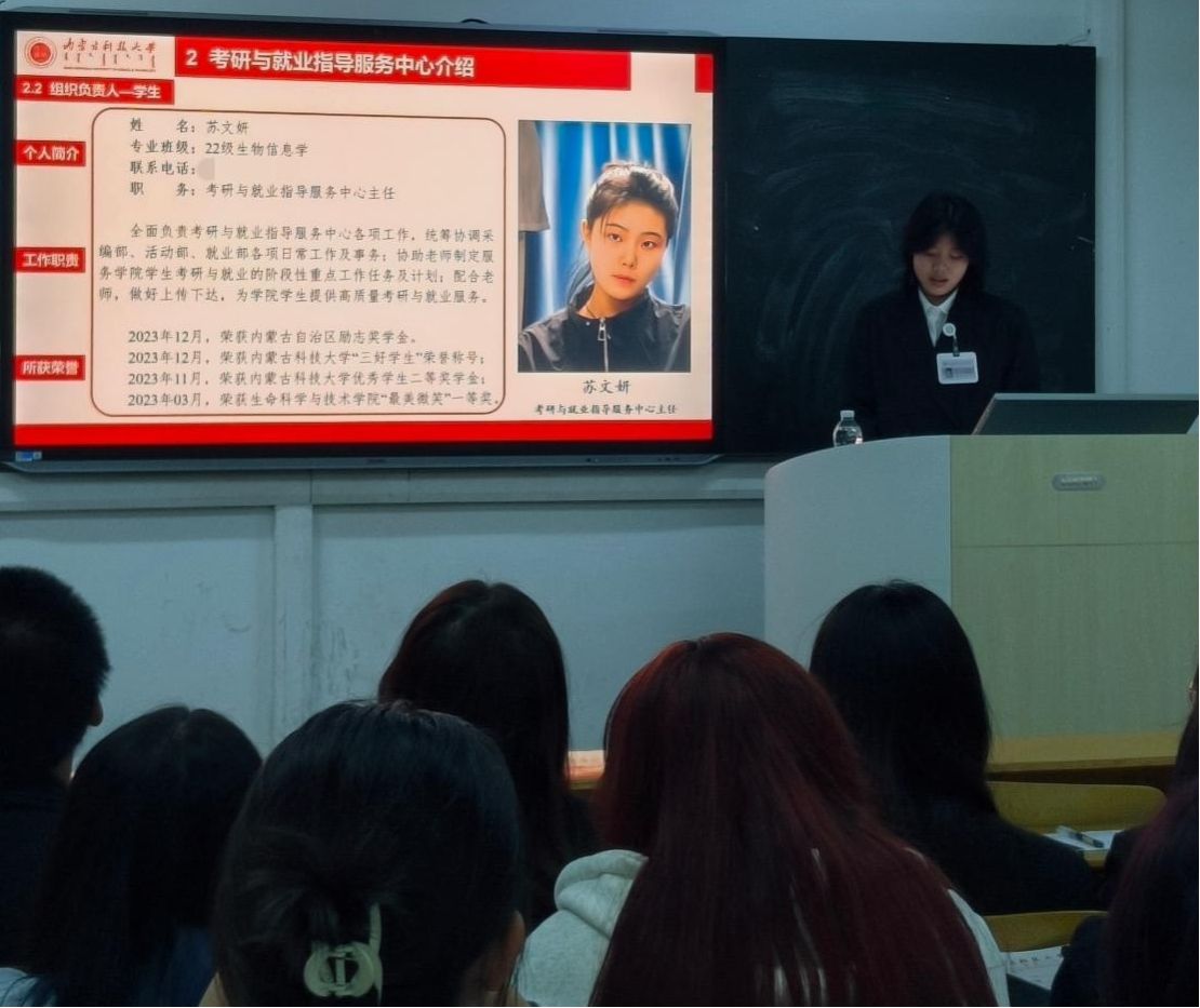 为使组织成员了解考研与就业工作内容,以便更好地开展下一步工作,乌日根老师首先对学校及学院的就业工作进行介绍。对双选会、专场招聘会等各类型招聘会的流程及注意事项进行详细介绍,并对选调生报名工作、职业规划大赛、“宏志助航”就业能力培训等阶段性重点工作也逐一介绍。同时,具体讲解了考研与就业指导服务中心的组织定位、工作内容、最终目标以及部门分工情况。