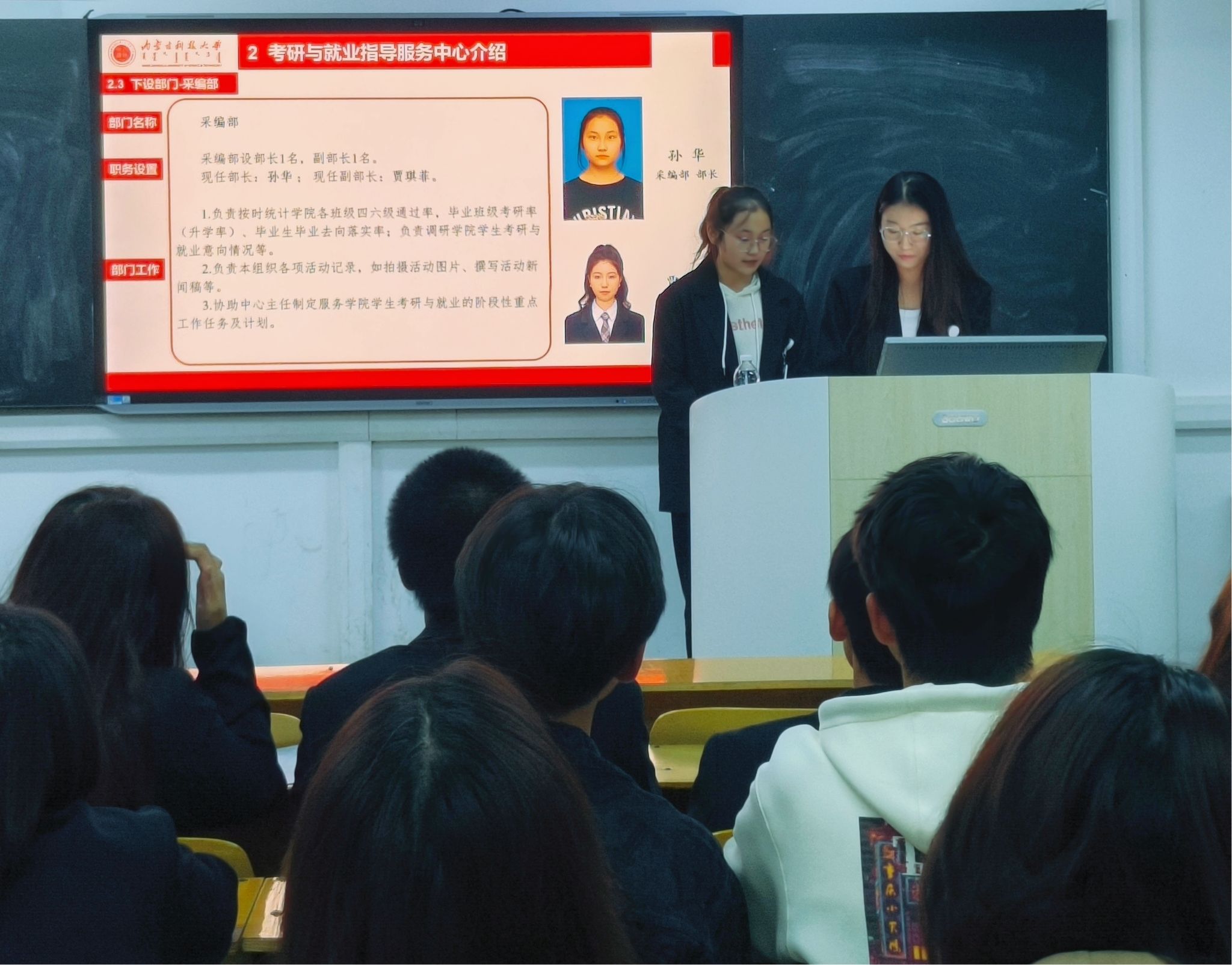 采编部部长孙华、副部长贾琪菲总结本部门职责为“对内收集数据+新媒体”,即面向学生收集统计考研就业相关数据,同时负责本组织各项活动记录,新闻拍摄等工作。
